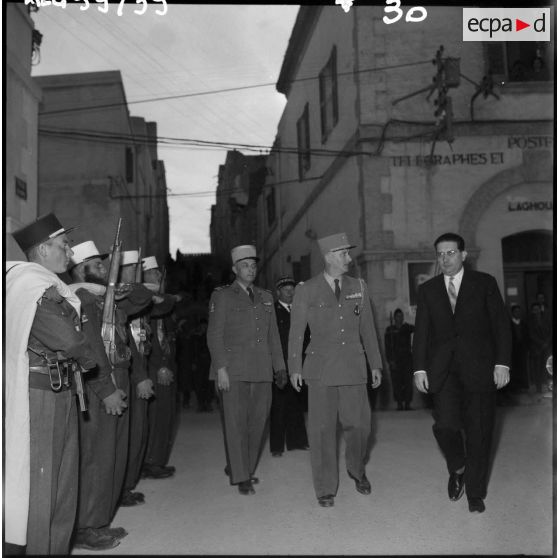 Laghouat. Voyage d'inspection. Jacques Soustelle passe la garde d'honneur en revue.