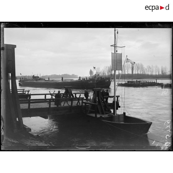 Sur le Rhin, à hauteur de la ville de Brussenheim, le pont bateau construit par le Génie est ouvert pour permettre aux péniches de traverser le fleuve. Poursuivant leur avancée, les troupes françaises pénètrent en Allemagne. A Landau, le 1er escadron du 9e RCCh (régiment de chasseurs à cheval) entre dans la ville.