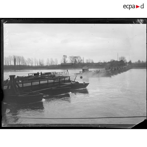 Drusenheim, le pont bateaux sur le Rhin ouvert par laisser un passage aux péniches.