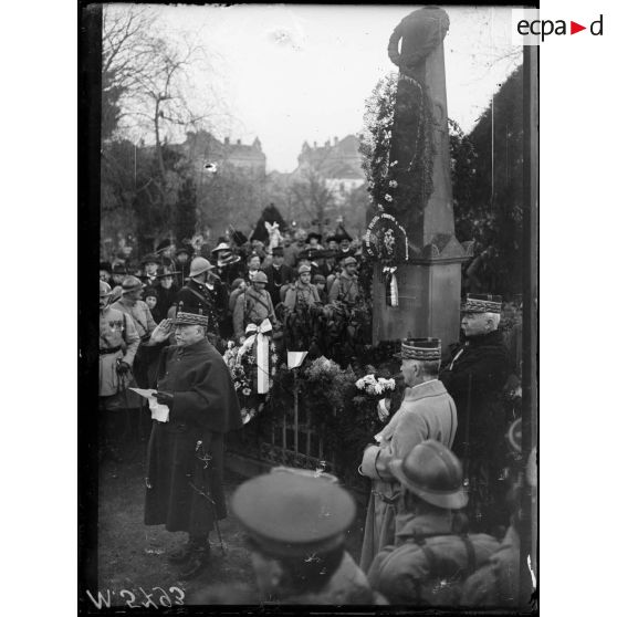 Wissembourg, le maire prononce un discours devant le monument du général Abel Douay mort le 4 août 1870.