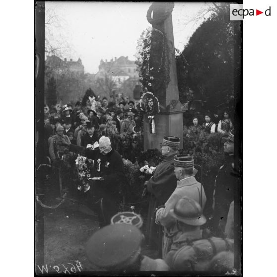 Haguenau, après une messe de Requiem, le Souvenir Français sous la présidence de M. Eichinger, porte la couronne aux morts de 1870 et à ceux de 1914-1918.