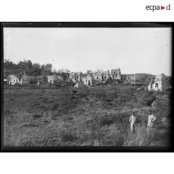 Condé-sur-Aisne (Aisne). Pont détruit sur l'Aisne au fond et à droite le village.