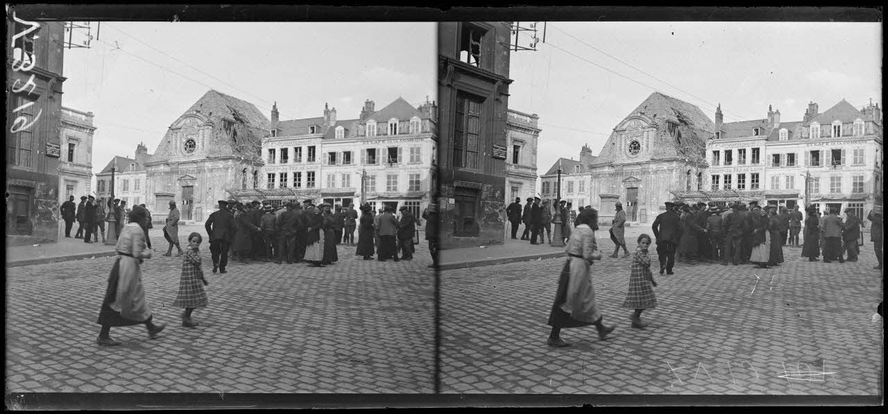 Saint-Quentin, visite de M. Clemenceau. Place de Longueville, blockhaus allemand pour mitrailleuse couvrant le carrefour et les rues.