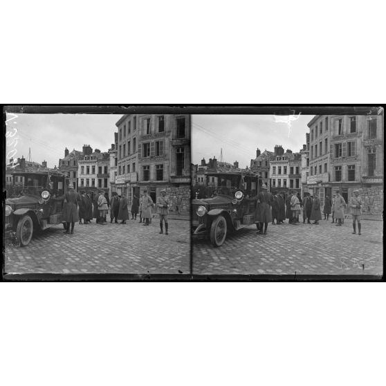 Saint-Quentin, visite de M. Clemenceau. M. Clemenceau, M. Renault, le général Mordacq place de l'hôtel de ville.