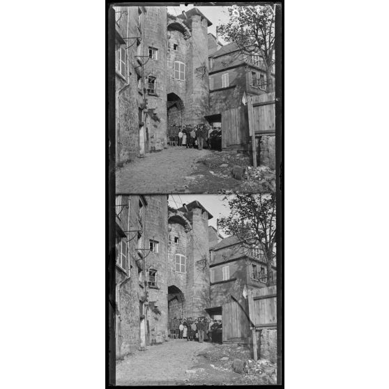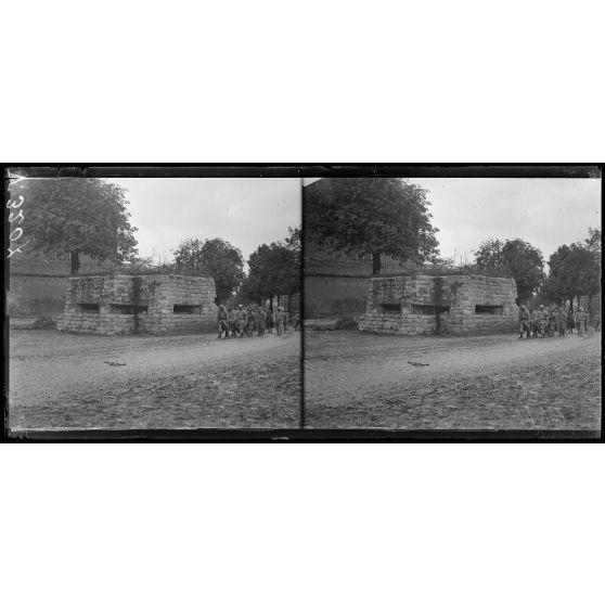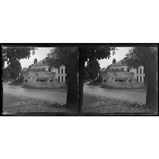 Saint-Quentin, visite de M. Clemenceau. Place de Longueville, blockhaus allemand pour mitrailleuse couvrant le carrefour et les rues.