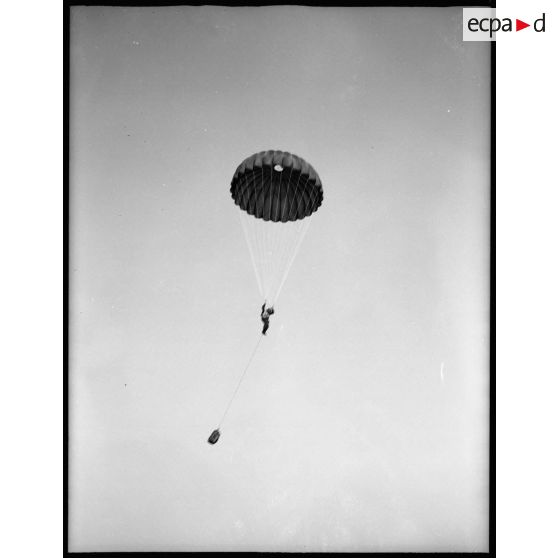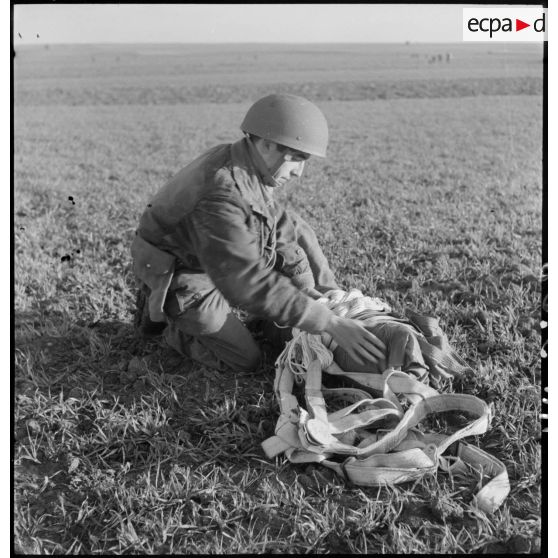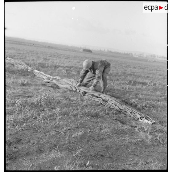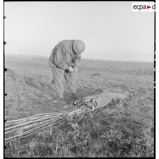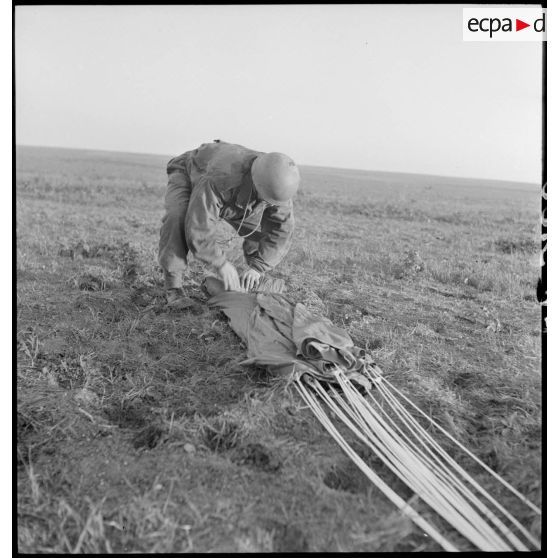 Un parachutiste français prend contact avec le sol lors de l'atterrissage.