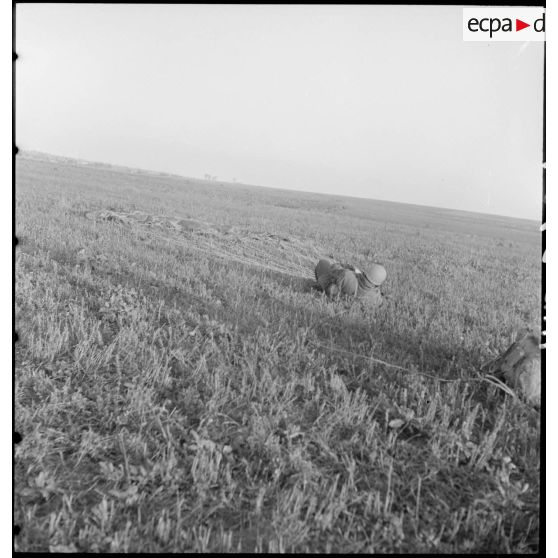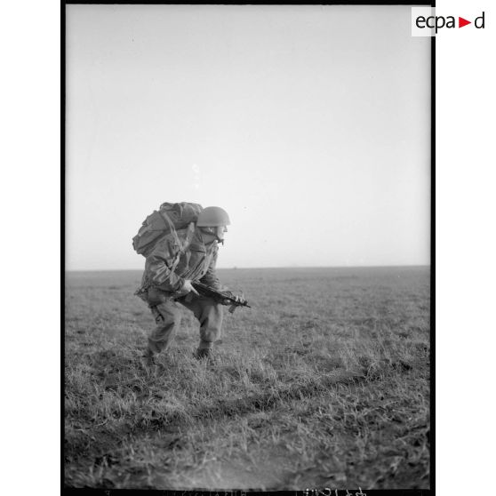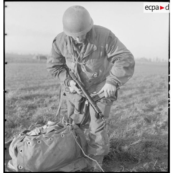 Un parachutiste français monte son arme automatique après avoir atterri sur le sol d'Epernay.