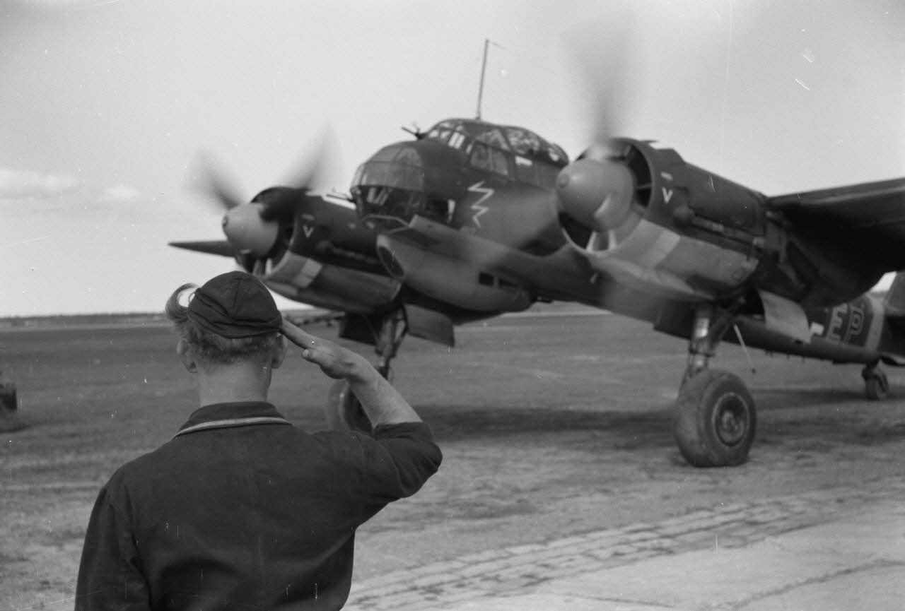 Un lieutenant, reconnaissable à son grade cousu sur la manche droite, observe le bombardier Junkers Ju-88 codé 5K+EP appartenant au Kampfgeschwader 3 Blitz (6.KG3 ou III./KG3).