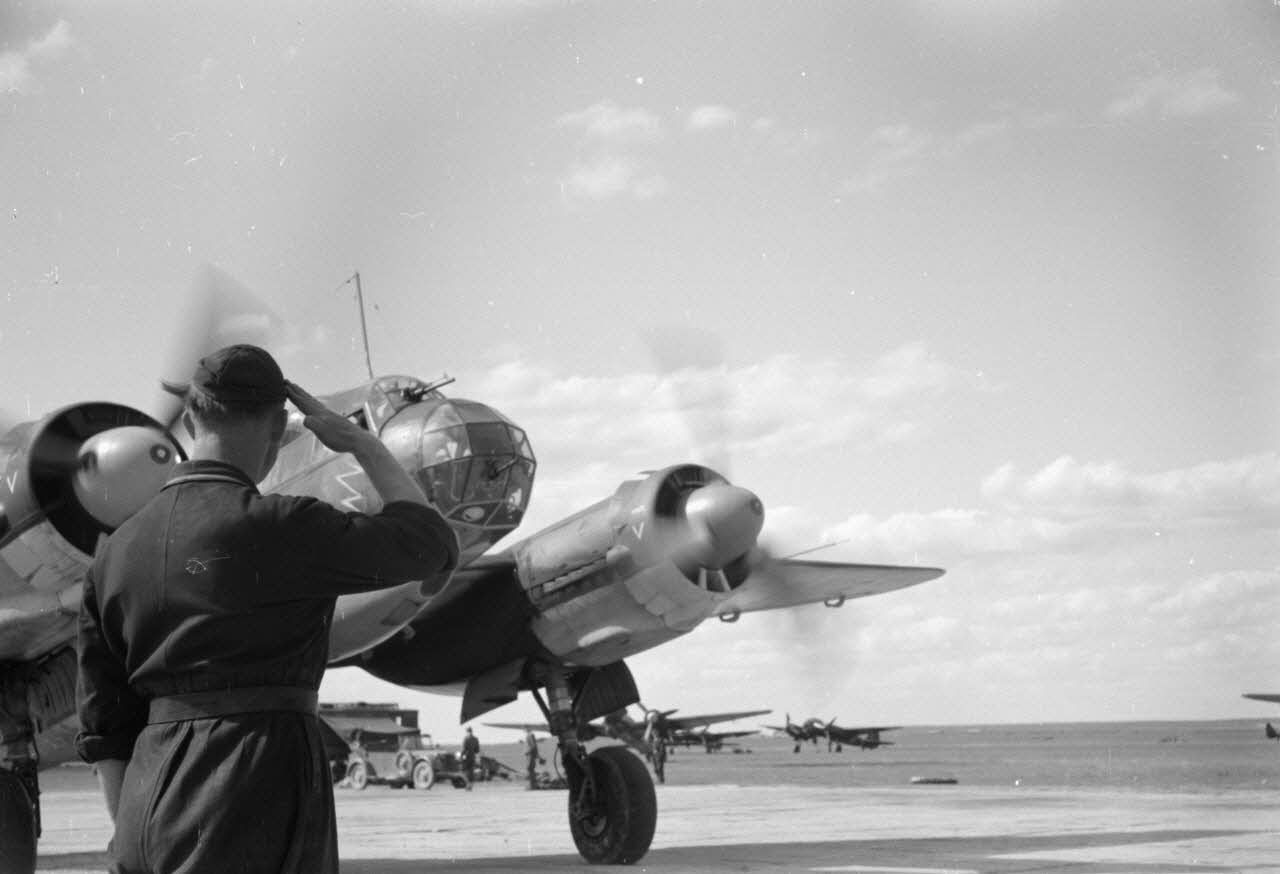 Le retour de mission d'un équipage de bombardier Junkers Ju-88 du Kampfgeschwader 3 Blitz, l'équipage est salué par les mécaniciens.