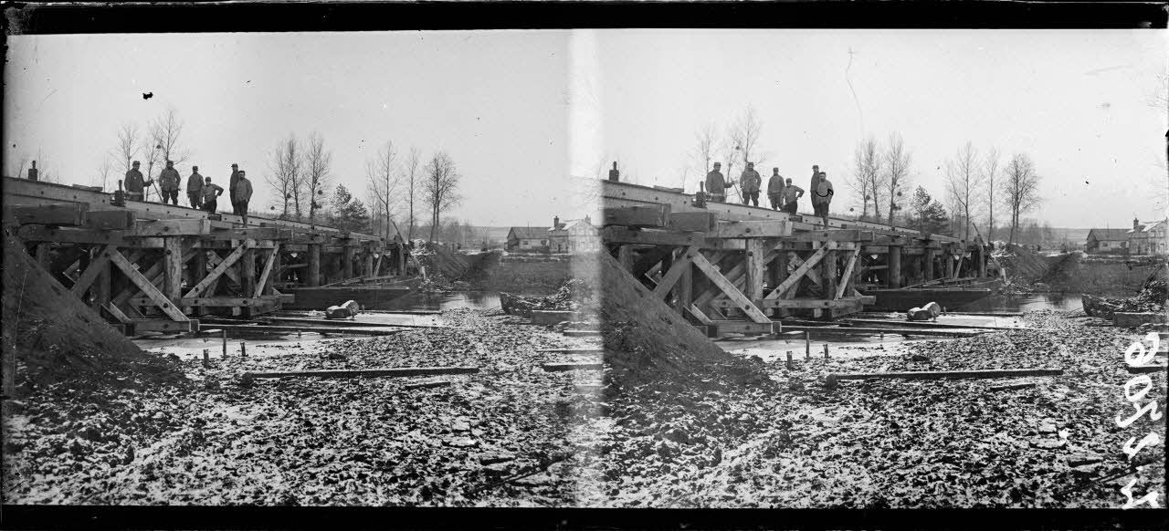 Au Breuil, dans la Marne, le génie construit un pont pour le passage d'une voie de chemin de fer, avec l'aide de territoriaux.