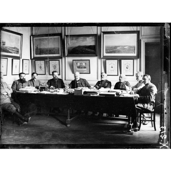 Ecole de guerre. Le contrôleur général Bossut, M. Joseph Denais, député, adjoint au contrôleur général et les officiers des différents services des bureaux : Lt Renout, Lt Arbitre, Lt Arné, Lt de Barbuat, adjudant Alliot, M. Joseph Denais, contrôleur général et Lt-colonel Chartier.