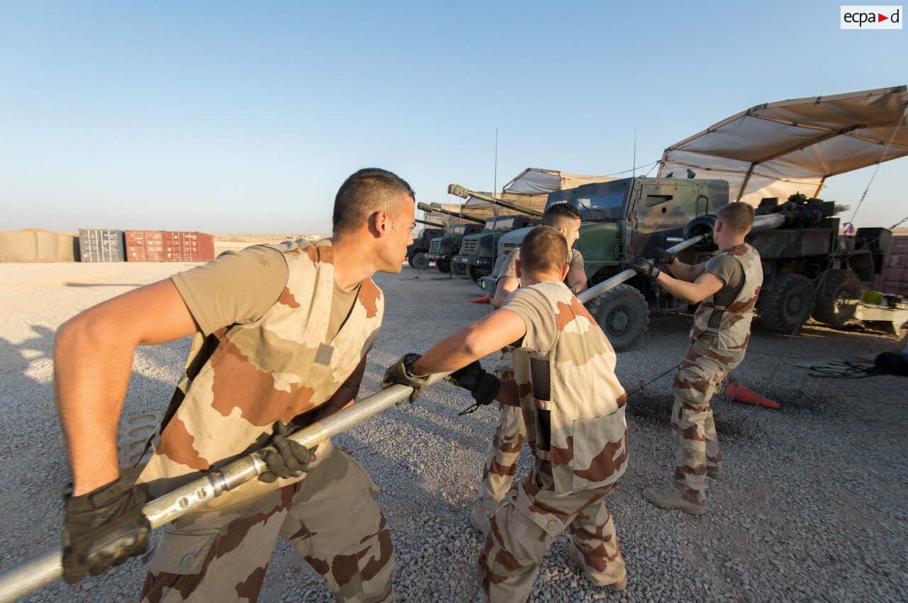- Des artilleurs du 3e régiment d'artillerie de marine (3e RAMa) portent des charges propulsives explosives à Al-Qaïm.