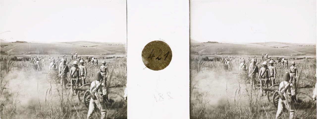 D68-42. Autour de Tananarive, les tirailleurs du 1er régiment de tirailleurs malgaches et les artilleurs de la 3e batterie du 7e régiment d'artillerie exécutent diverses manoeuvres. Ces évolutions sont destinées à apprécier la mobilité des batteries sur le terrain et à s'entraîner au tir. Le relief tourmenté, les cours d'eau et l'absence de routes praticables accentuent la difficulté des déploiements. Les rivières sont traversées à gué ou franchies sur d'étroites pirogues mises bout à bout. Deux types de canons de Bange de calibre de 80 mm sont alors utilisés : les canons de campagne, tirés par des attelages, et les canons de montagne, transportés en pièces détachées par des mulets. Les hommes sont équipés de mousquetons d'artillerie modèle 1892. Arrivés sur le champ de tir, les mulets sont déchargés et les pièces mises en batterie pour effectuer les exercices de tir.