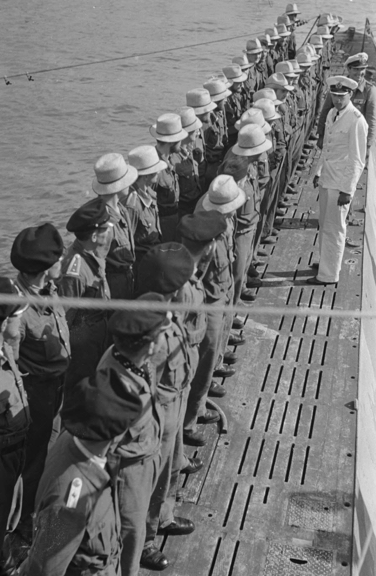 Le capitaine de corvette (Korvettenkapitän) Herbert Sohler, représentant de la 7.Unterseebootflottille, passe en revue l'équipage du sous-marin U-69 du Kapitänleutnant Jost Metzler.