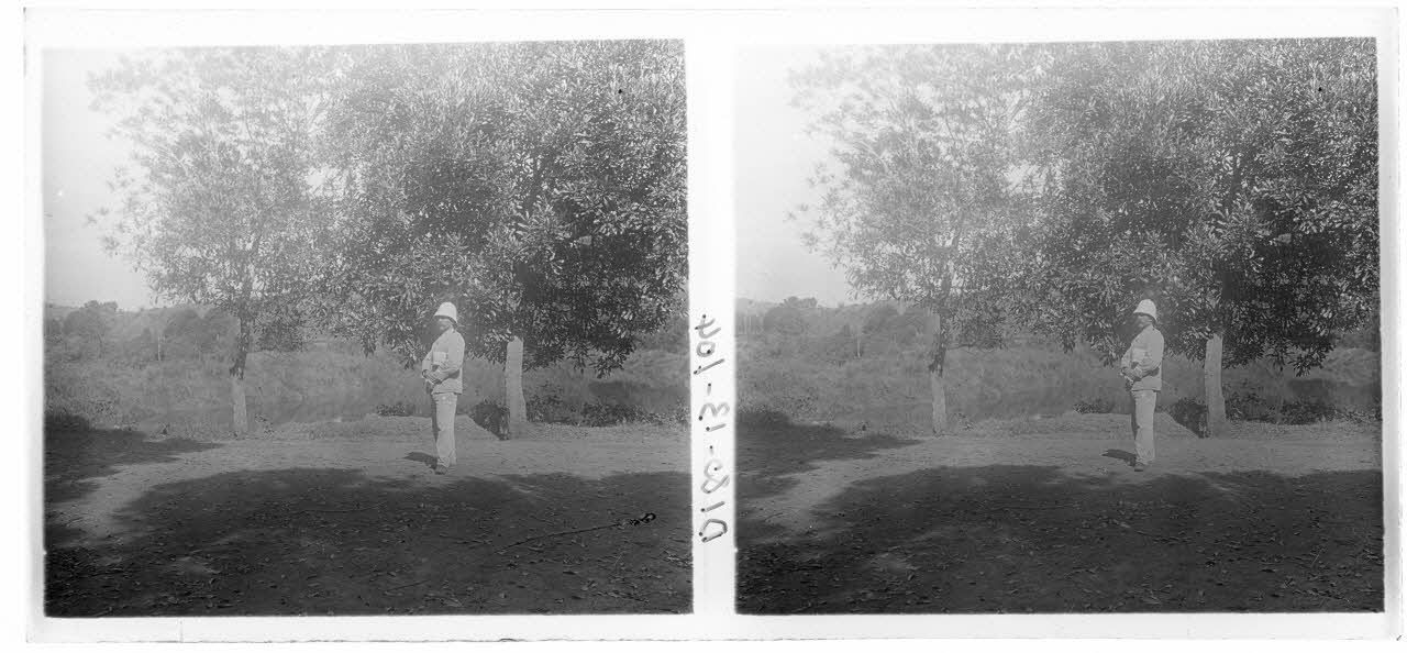 [Le capitaine Emile Coquibus photographié dans la cour de sa case, lac en arrière-plan].