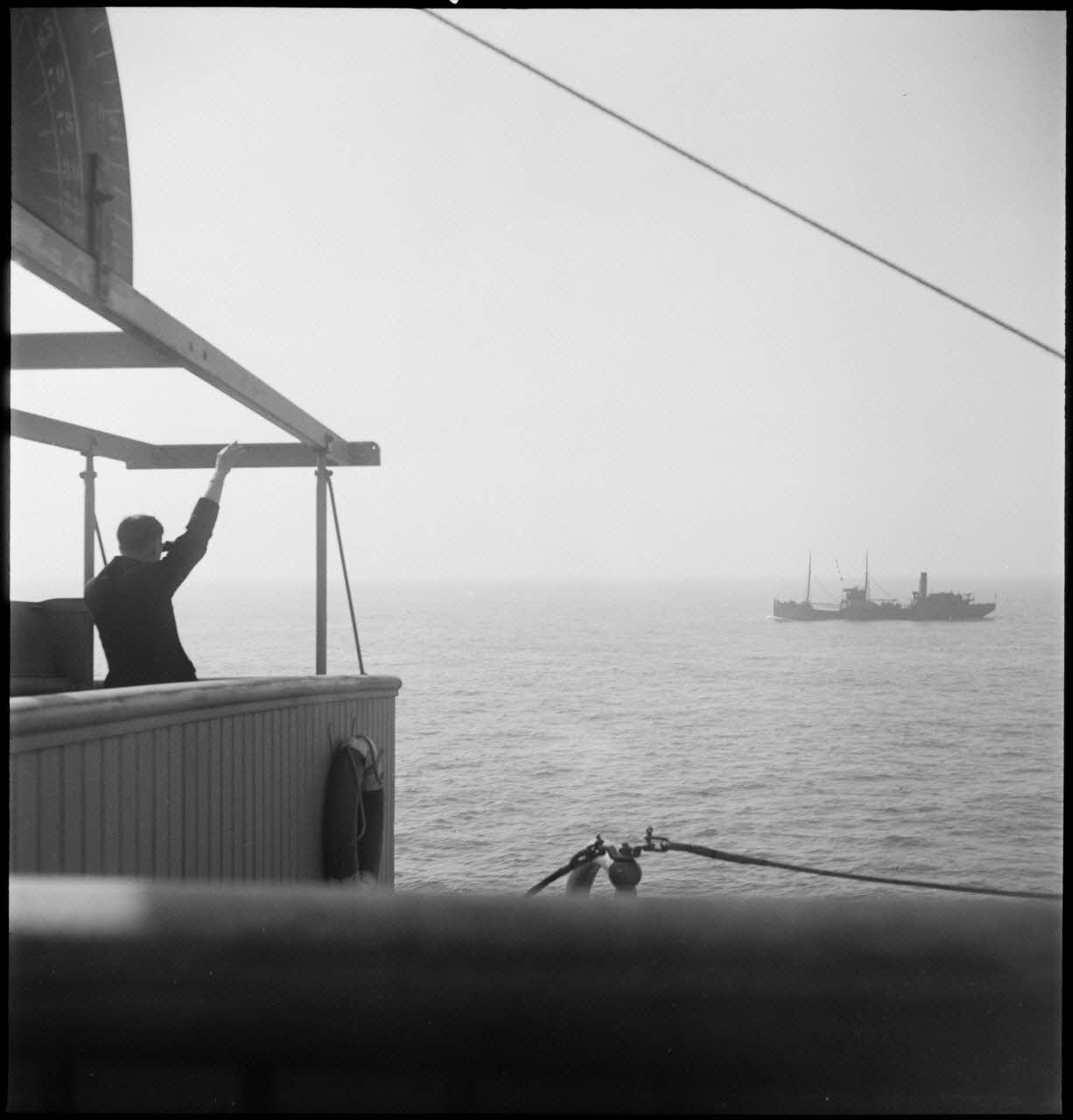 Lieutenant de vaisseau de quart à la passerelle du cargo réquisitionné Yang Tsé. Au premier plan, un transmetteur d'ordres mécanique ou Chadburn.