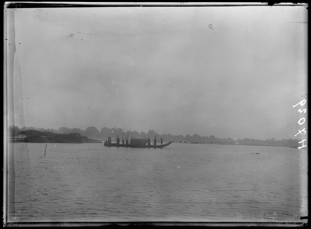Puis c'est l'arrivée à l'embouchure du Chari, sur le lac Tchad, où la mission reste deux jours et campe au bord de l'eau. L'opérateur prend des clichés des deux pirogues duconvoi, des rives du lac, des pagayeurs posant avec leurs perches et leurs pagaies dressées vers le ciel. Le lac est bordé d'une végétation de roseaux et de papyrus dont les riverains construisent des pirogues.