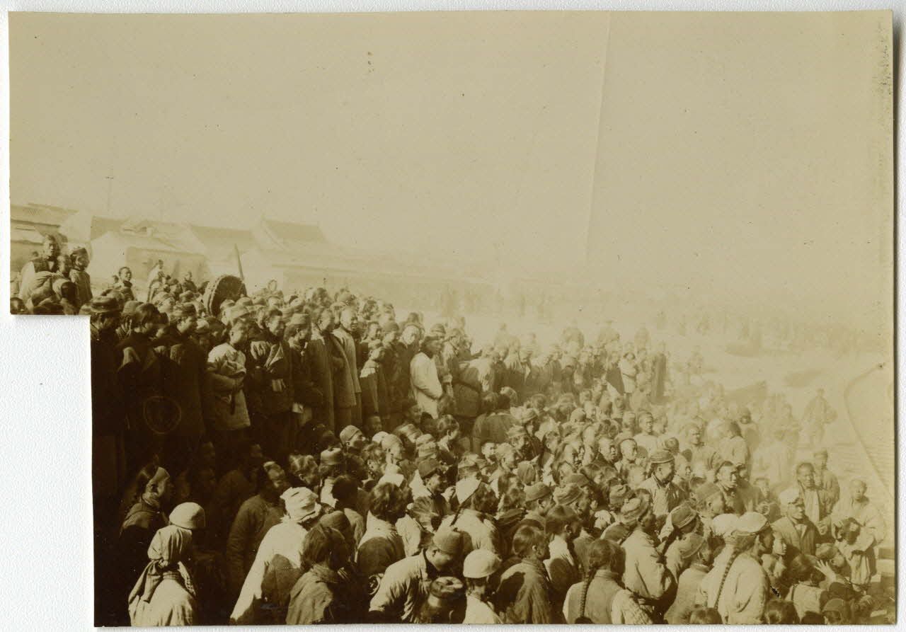Le chemin de fer français dans Pékin. Foule chinoise regardant passer le train d'inauguration à Choun-tche-Men. [légende d'origine]