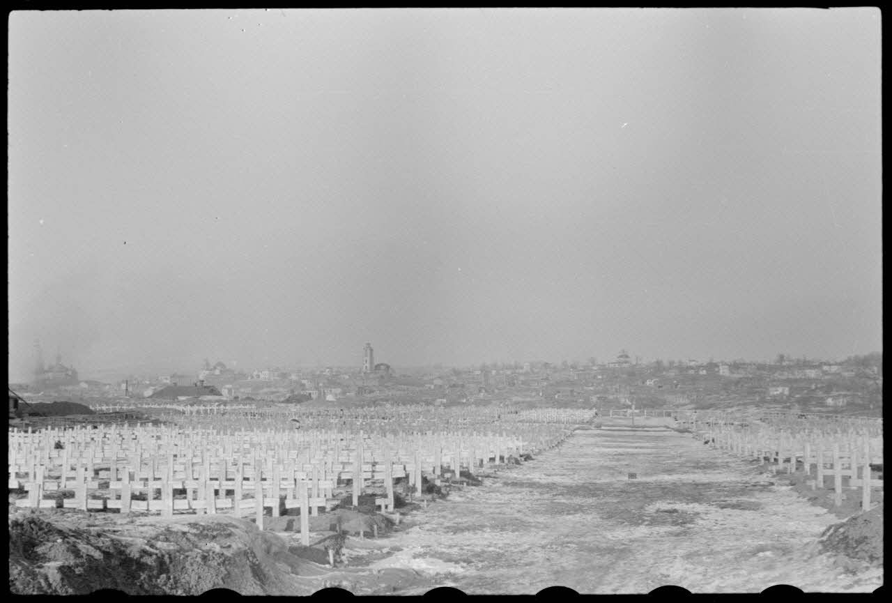 Lors de l'opération Büffelbewegung, à Viazma (Wjasma), la retraite allemande à travers des villages soviétiques et un cimetière allemand à Wjasma.
