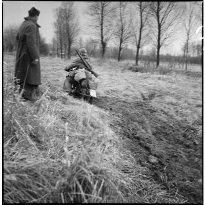 Parallèlement les pattes de collet des soldats portent le numéro 6 avec trois chevrons, il est possible de penser à une unité de cuirassiers motorisés ou de dragons motorisés (sûrement le 6e Cuirassiers de la 1ère DLM puisqu'un soldat porte sur son calot l'insigne division de la 1re DLM, photographie A580), alors qu'à la date du reportage seules des unités de la 2e DLM se trouvent aux alentours de Mazinghien dans le département du Nord.