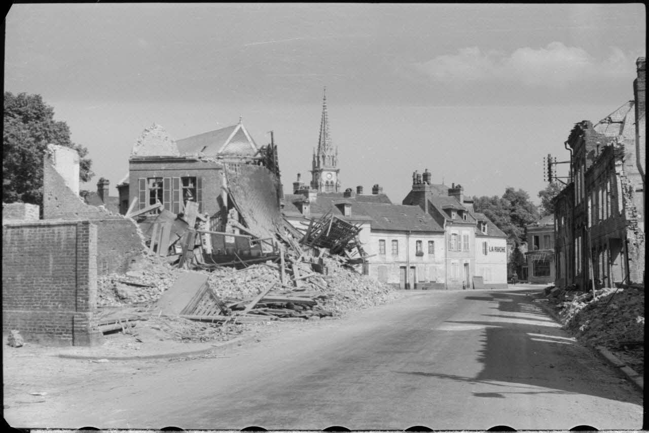 A Abbeville, des prisonniers français du 15e RI sont encadrés par des soldats allemands, ils marchent dans une rue dévastée. Le clocher de l'église Saint-Jacques dépasse des maisons (DAA 557 L09 à L11).