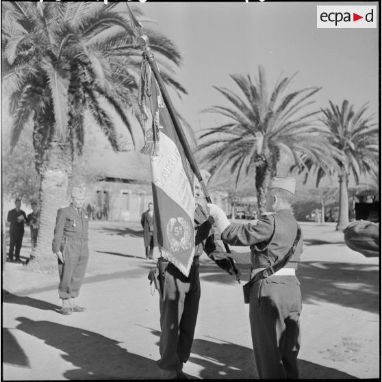 Le commandant Dulac remet le drapeau du 5ème bataillon des tirailleurs algériens (BTA) au colonel Blanchet.