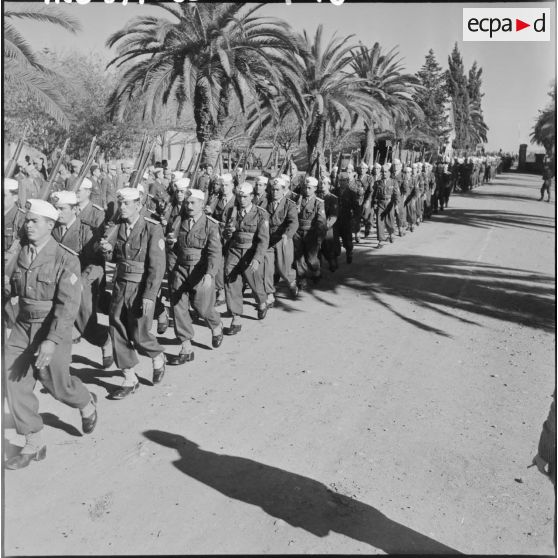 Prise de commandement au 5e bataillon des tirailleurs algériens (BTA) à Maison Blanche en présence du général Jacques Massu.