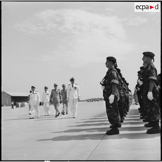 Le général d'Armée Raoul Salan commandant supérieur interarmes, le général Edmond Jouhaud commandant la 5e région aérienne et le colonel Ducourneau chef du cabinet militaire du ministre de l'Algérie saluent le drapeau du GT 1/62 et passent en revue les hommes de troupe de la BA 149 (Maison Blanche) et les hommes de troupe des commandos n° 541.