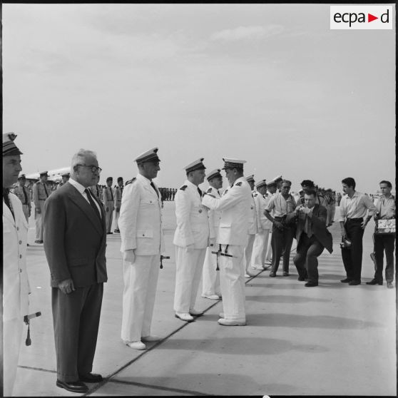 Le général d'Armée Raoul Salan, commandant supérieur interarmes, le général Edmond Jouhaud, commandant la 5ème région aérienne et le colonel Ducourneau, chef du cabinet militaire du ministre de l'Algérie passent en revue les hommes de troupes de la base aérienne 149.