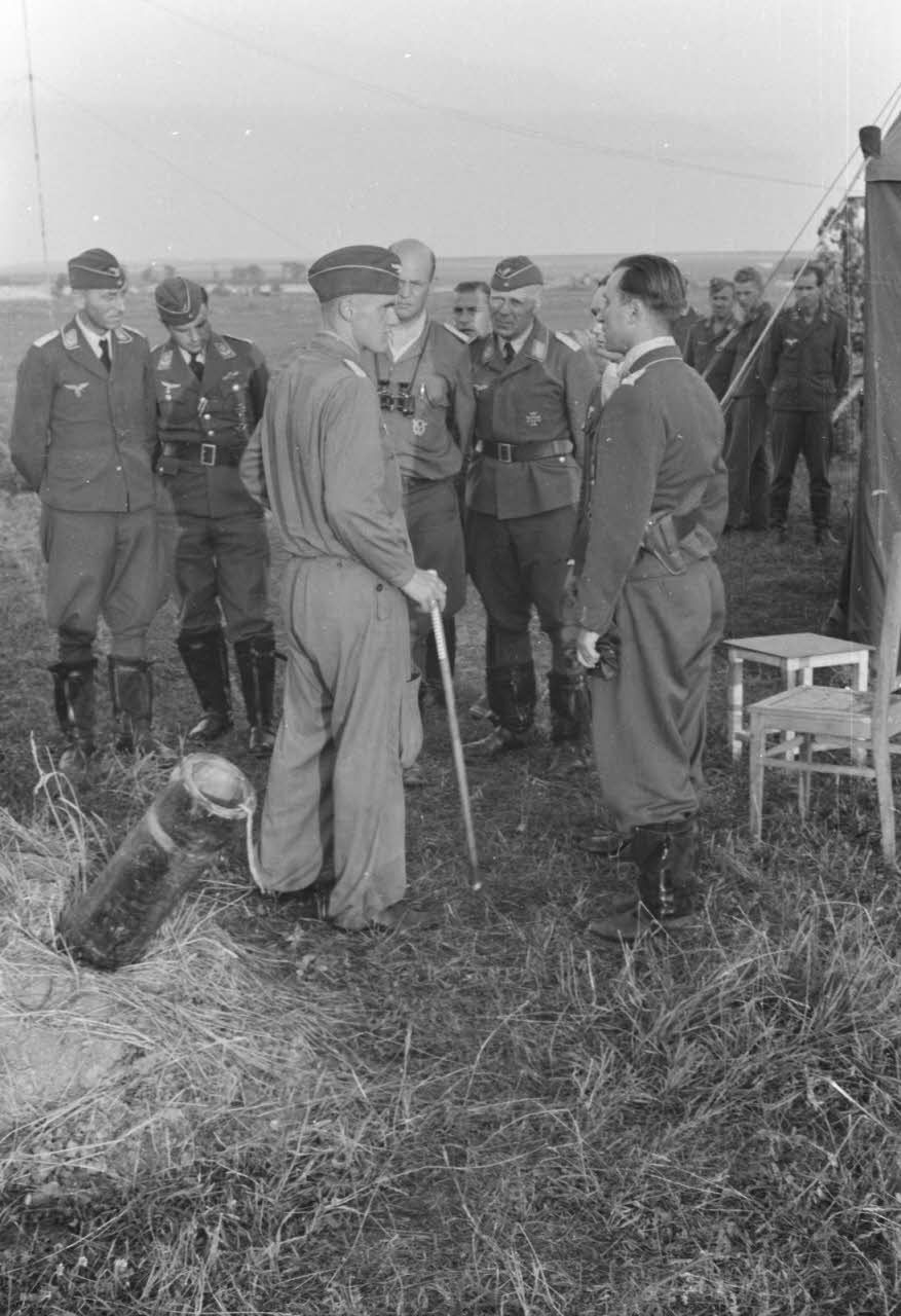 Le commandant (Major) Günther Lüzow, Kommodore du Jagdgeschwader JG 3 "Udet" en discussion avec des pilotes de la 3e escadrille de chasse.