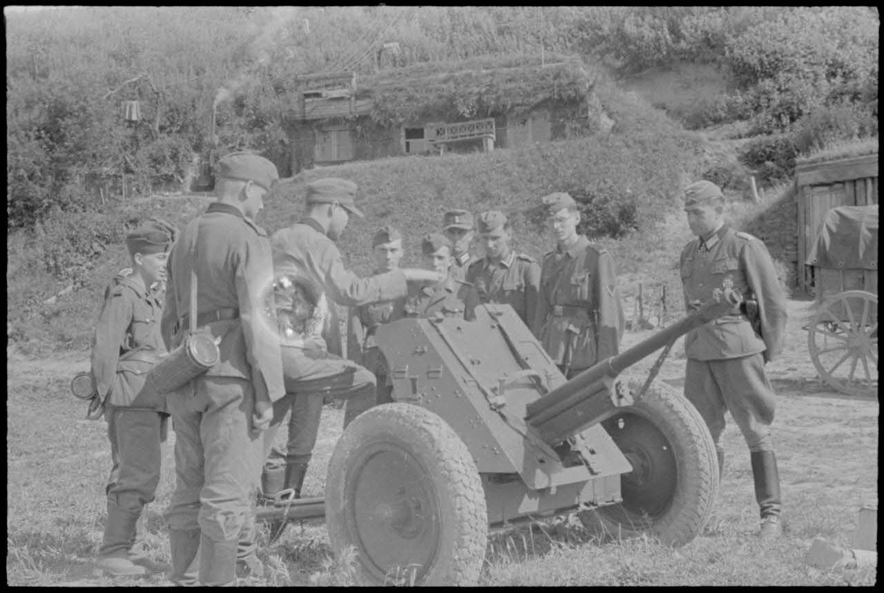 Le commandant (Major) Hans Müller apporte son expérience du terrain à des fantassins en formation derrière une pièce de 3,7 cm Pak 36/37.
