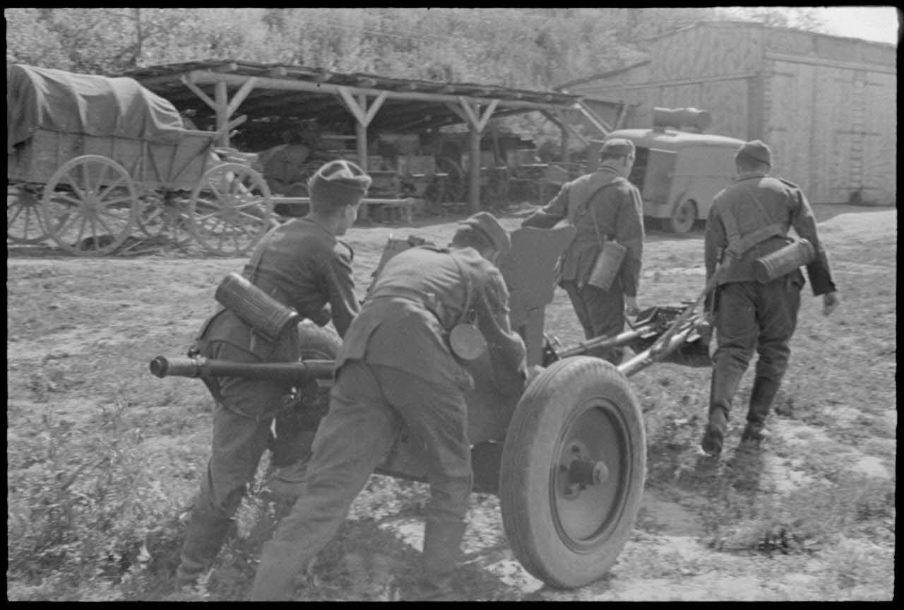 Des fantassins en formation derrière une pièce de 3,7 cm Pak 36/37.