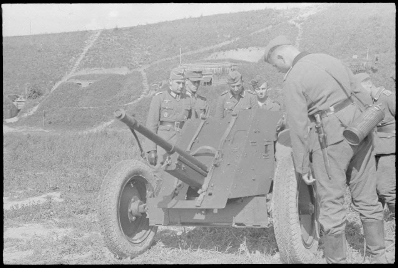 Le commandant (Major) Hans Müller apporte son expérience du terrain à des fantassins en formation derrière une pièce de 3,7 cm Pak 36/37.