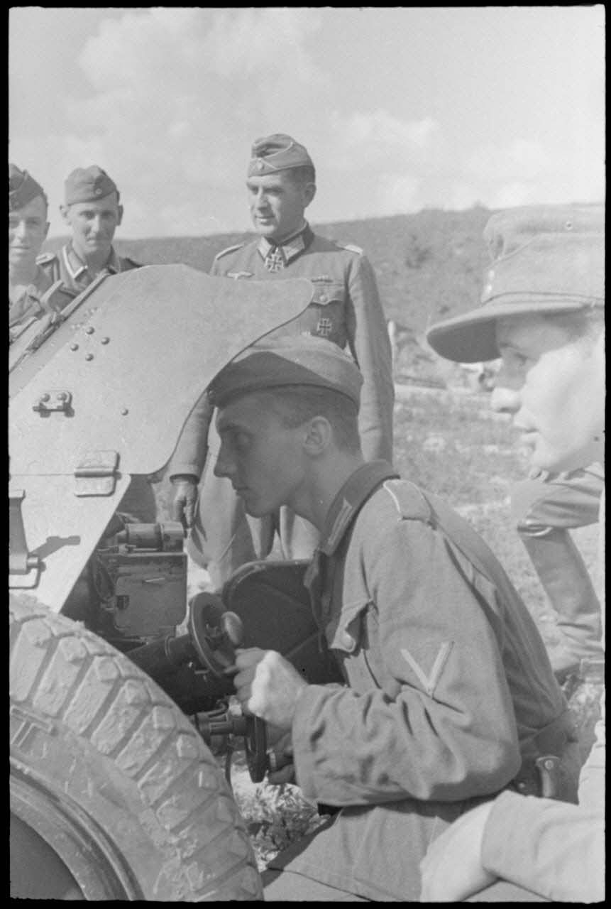 Le commandant (Major) Hans Müller apporte son expérience du terrain à des fantassins en formation derrière une pièce de 3,7 cm Pak 36/37.