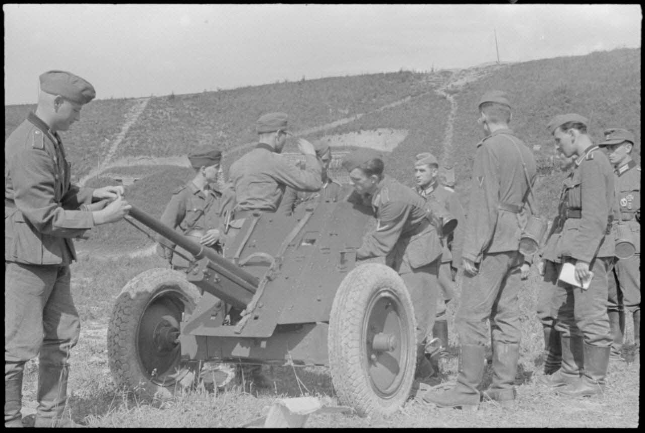 Le commandant (Major) Hans Müller apporte son expérience du terrain à des fantassins en formation derrière une pièce de 3,7 cm Pak 36/37.