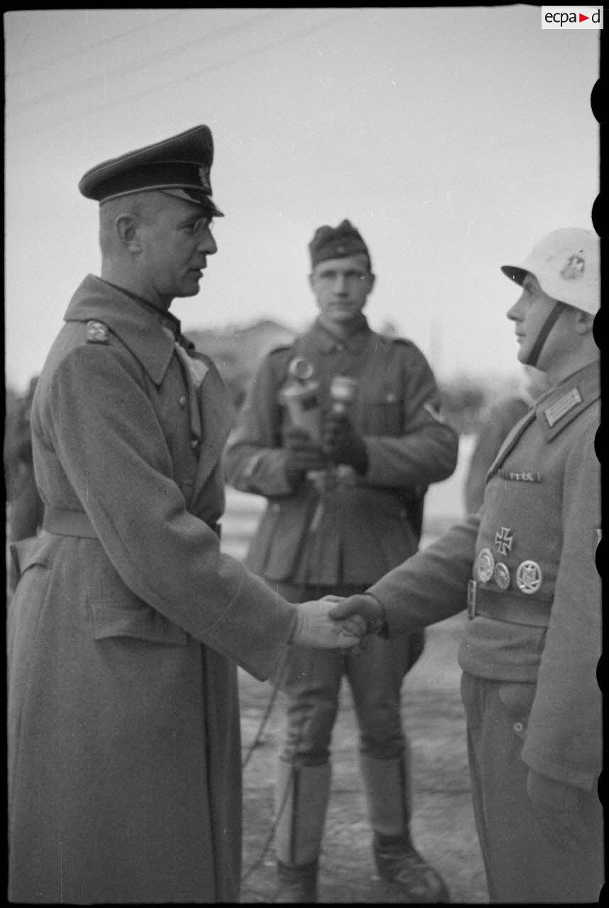Le commandant (Major) Horst-Wolf Hoppe remet une décoration à un caporal, au centre le lieutenant de réserve Julius Stehler.