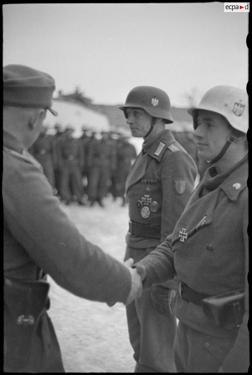Le commandant (Major) Horst-Wolf Hoppe remet une décoration à un caporal, au centre le lieutenant de réserve Julius Stehler.