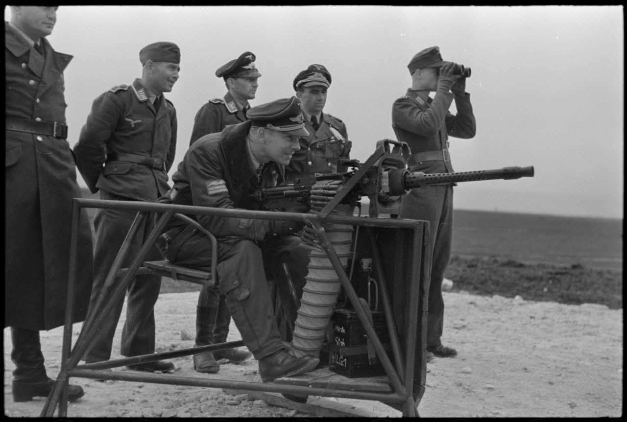 Le commandant (Major) Karl-Heinz Schomann I./LG1 (Lehrgeschwader 1) titulaire de la croix de chevalier de la croix de fer (Ritterkreuz) s'exerce au tir à la mitrailleuse.