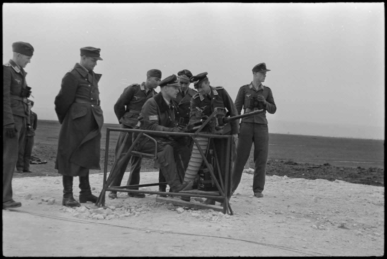 Le commandant (Major) Karl-Heinz Schomann I./LG1 (Lehrgeschwader 1) titulaire de la croix de chevalier de la croix de fer (Ritterkreuz) s'exerce au tir à la mitrailleuse.