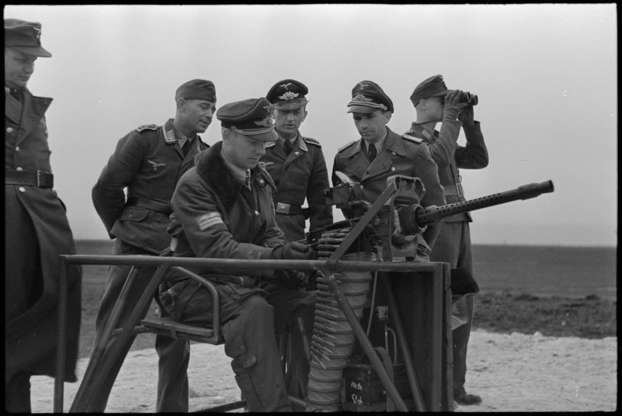 Le commandant (Major) Karl-Heinz Schomann I./LG1 (Lehrgeschwader 1) titulaire de la croix de chevalier de la croix de fer (Ritterkreuz) s'exerce au tir à la mitrailleuse.
