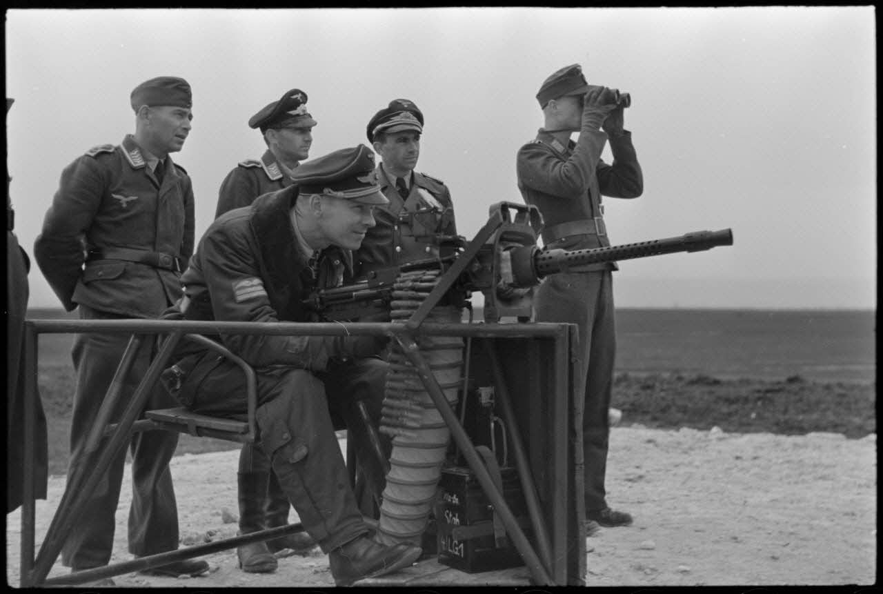 Le commandant (Major) Karl-Heinz Schomann I./LG1 (Lehrgeschwader 1) titulaire de la croix de chevalier de la croix de fer (Ritterkreuz) s'exerce au tir à la mitrailleuse.