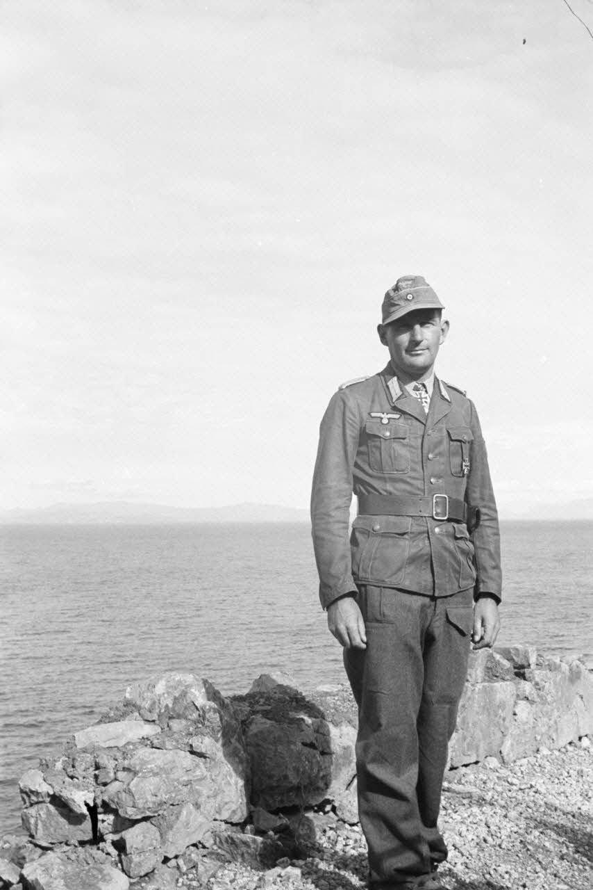 Le Major (commandant) Sylvester von Saldern Brallentin quitte un bâtiment occupé par le I./ Infanterie Regiment 65 ou la 22 Infanterie-Division ( 22-ID). Von Saldern Brallentin monte à bord d'une jeep britannique capturée et parcoure l'île de Samos et notamment le secteur du port de Vathy. A l'arrière de cette jeep d'origine britannique, le nom du Major von Saldern Brallentin est indiqué. Le Major pose pour le reporter certainement suite à sa remise de décoration (Ritterkreuz). On le retrouve notamment devant un semi-chenillé Sd.kfz. 10/5 posté pour la défense du port de Vathy.