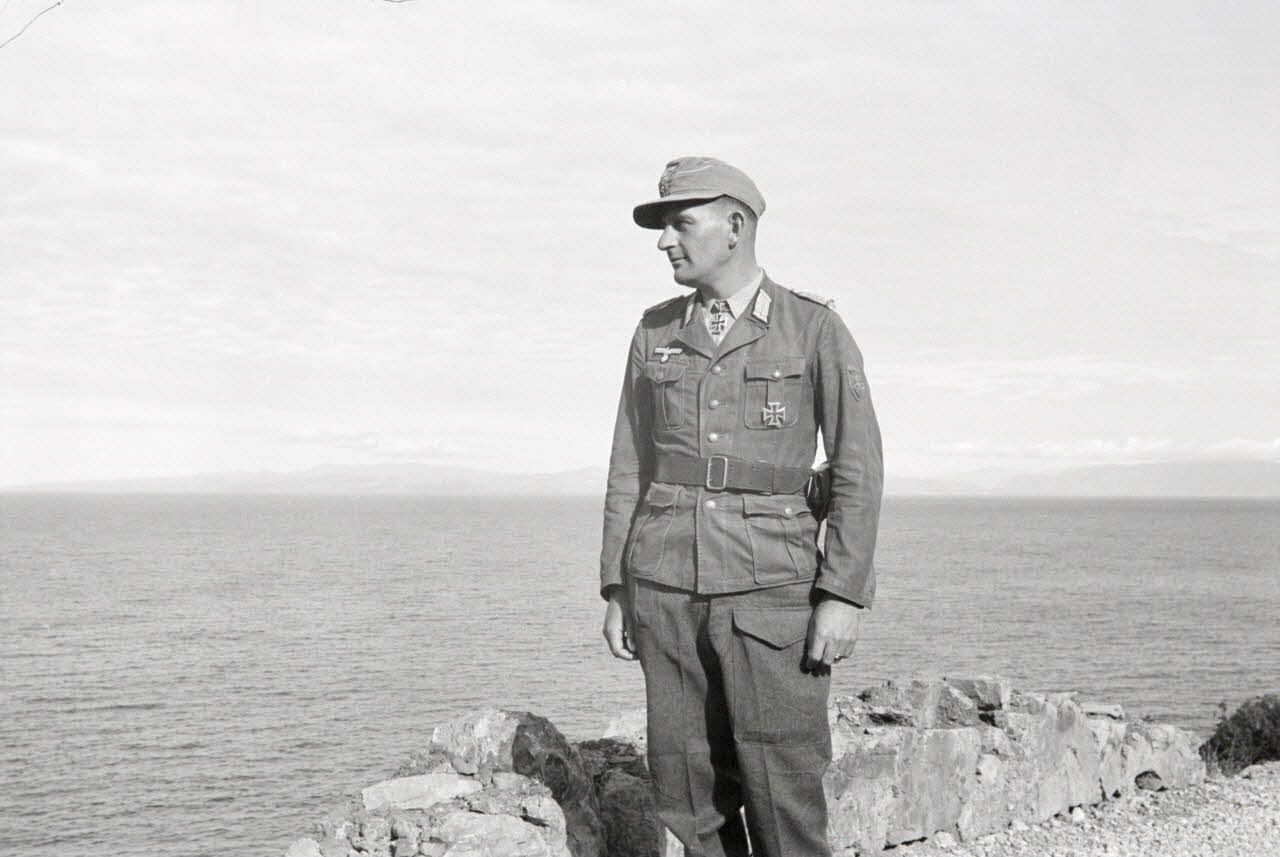 Le Major (commandant) Sylvester von Saldern Brallentin quitte un bâtiment occupé par le I./ Infanterie Regiment 65 ou la 22 Infanterie-Division ( 22-ID). Von Saldern Brallentin monte à bord d'une jeep britannique capturée et parcoure l'île de Samos et notamment le secteur du port de Vathy. A l'arrière de cette jeep d'origine britannique, le nom du Major von Saldern Brallentin est indiqué. Le Major pose pour le reporter certainement suite à sa remise de décoration (Ritterkreuz). On le retrouve notamment devant un semi-chenillé Sd.kfz. 10/5 posté pour la défense du port de Vathy.
