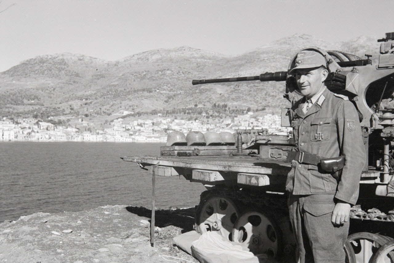 Le Major (commandant) Sylvester von Saldern Brallentin quitte un bâtiment occupé par le I./ Infanterie Regiment 65 ou la 22 Infanterie-Division ( 22-ID). Von Saldern Brallentin monte à bord d'une jeep britannique capturée et parcoure l'île de Samos et notamment le secteur du port de Vathy. A l'arrière de cette jeep d'origine britannique, le nom du Major von Saldern Brallentin est indiqué. Le Major pose pour le reporter certainement suite à sa remise de décoration (Ritterkreuz). On le retrouve notamment devant un semi-chenillé Sd.kfz. 10/5 posté pour la défense du port de Vathy.