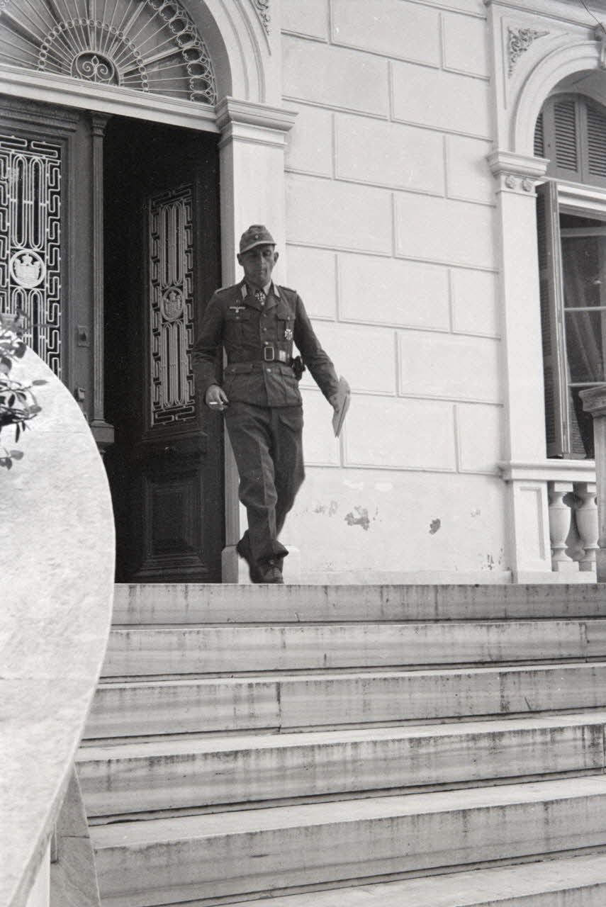 Le Major (commandant) Sylvester von Saldern Brallentin quitte un bâtiment occupé par le I./ Infanterie Regiment 65 ou la 22 Infanterie-Division ( 22-ID). Von Saldern Brallentin monte à bord d'une jeep britannique capturée et parcoure l'île de Samos et notamment le secteur du port de Vathy. A l'arrière de cette jeep d'origine britannique, le nom du Major von Saldern Brallentin est indiqué. Le Major pose pour le reporter certainement suite à sa remise de décoration (Ritterkreuz). On le retrouve notamment devant un semi-chenillé Sd.kfz. 10/5 posté pour la défense du port de Vathy.