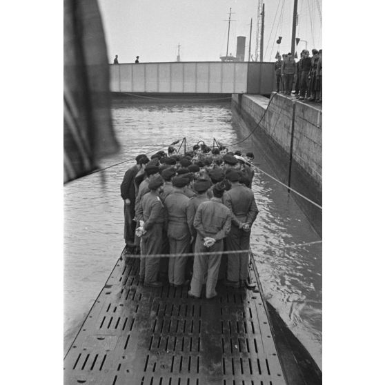 De retour au port de Saint-Nazaire, l'équipage du sous-marin U-74 se tient sur le pont navire.