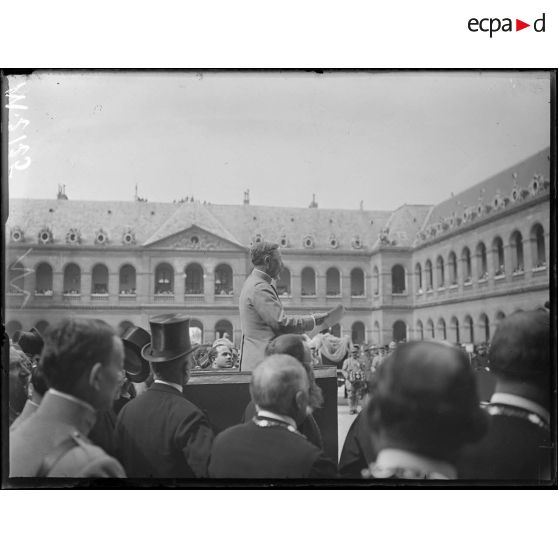 Obsèques du général Galiéni aux Invalides, le général Rocques prononçant son discours.