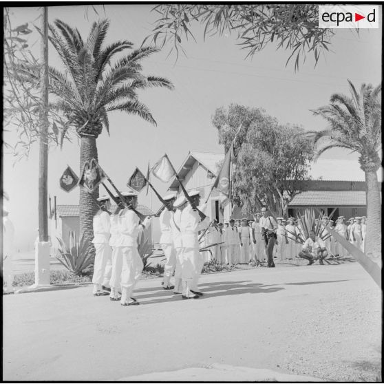 Le vice-amiral Auboyneau saluant la garde au drapeau des fusiliers-marins au centre de formation Siroco.