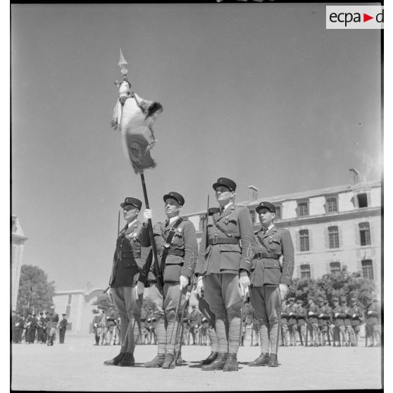Le drapeau de l'Ecole militaire d'infanterie et sa garde d'honneur.