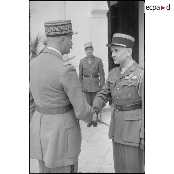Le général Giraud félicite le colonel Jousse après lui avoir remis la croix de guerre au palais d'été d'Alger.